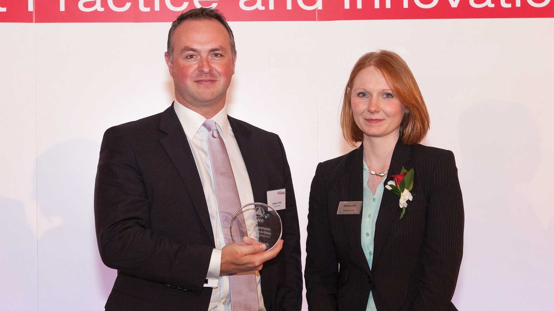 Photo of Andrew P. Reid from Deutsche Bank accepting on behalf of Sany Group with Eleanor Hill.