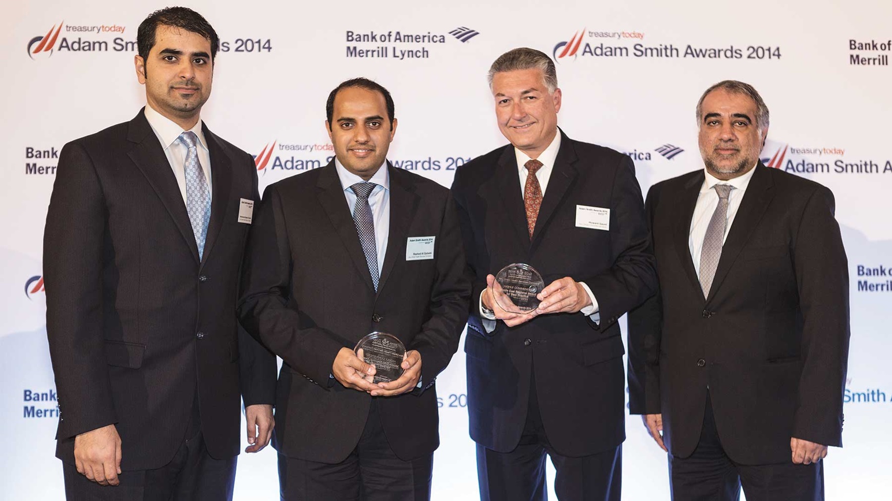 Photo of Rashed Al Qubaisi of Abu Dhabi Health Services Company collecting the Award on behalf of Bernhard Solleder and Howard Gaunt and Mohamed Al Ali of Abu Dhabi Commercial Bank.