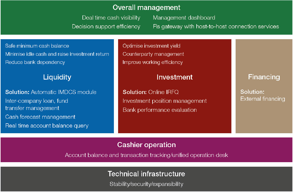 To overcome the challenges stated above, the Alibaba treasury team evaluated the situation and decided to develop a treasury management platform in-house. The treasury management intelligence (TMI) platform is a web-based treasury management solution which provides cash visibility, transaction based liquidity, investment and financing management systems, with standardised operation process controls in place and management decision-making support.