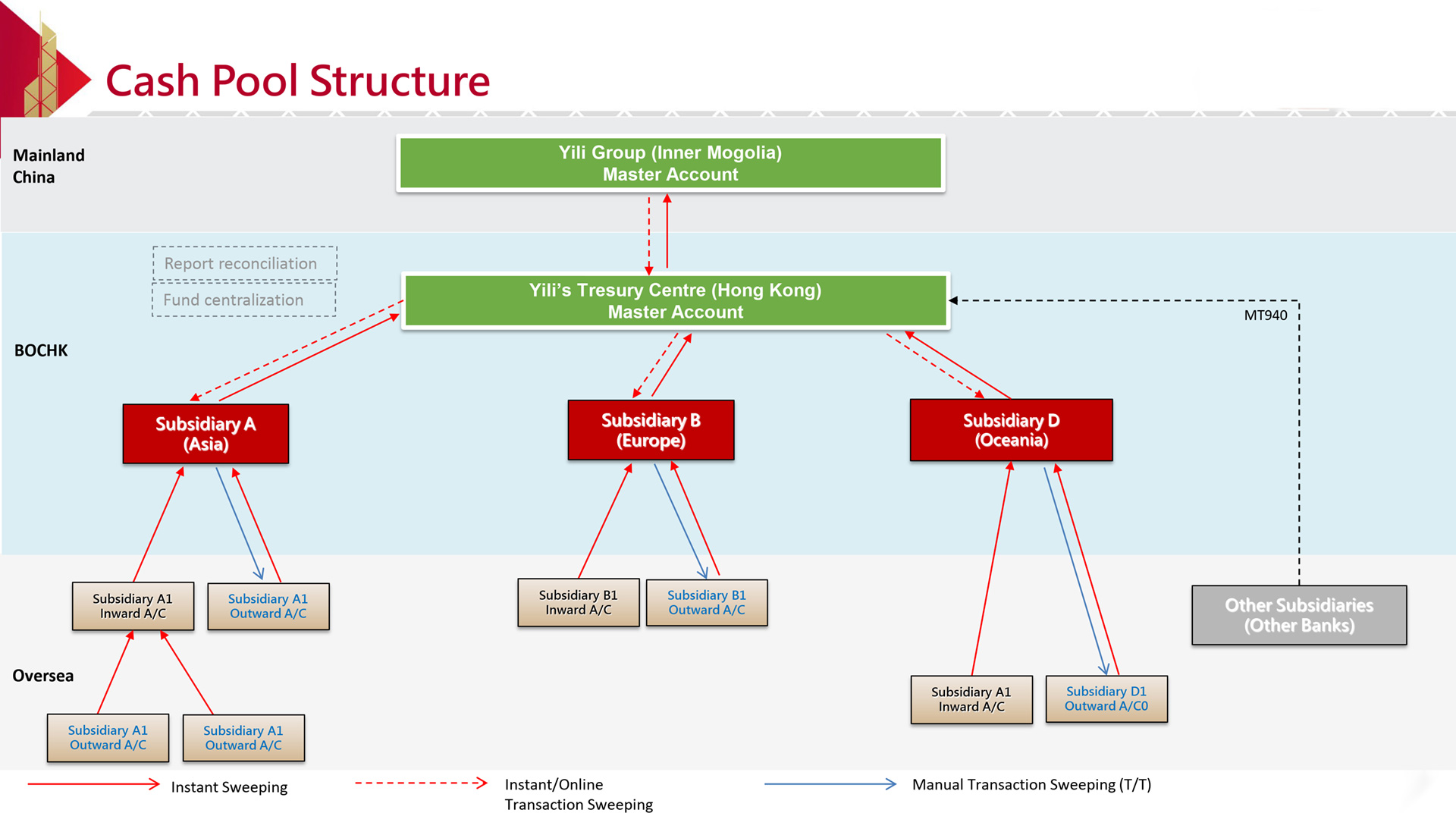 Bank of China (Hong Kong) Limited was tasked with implementing a centralised treasury management solution including comprehensive global account and cash management for Yili to mitigate the above-mentioned pain points in three phases: