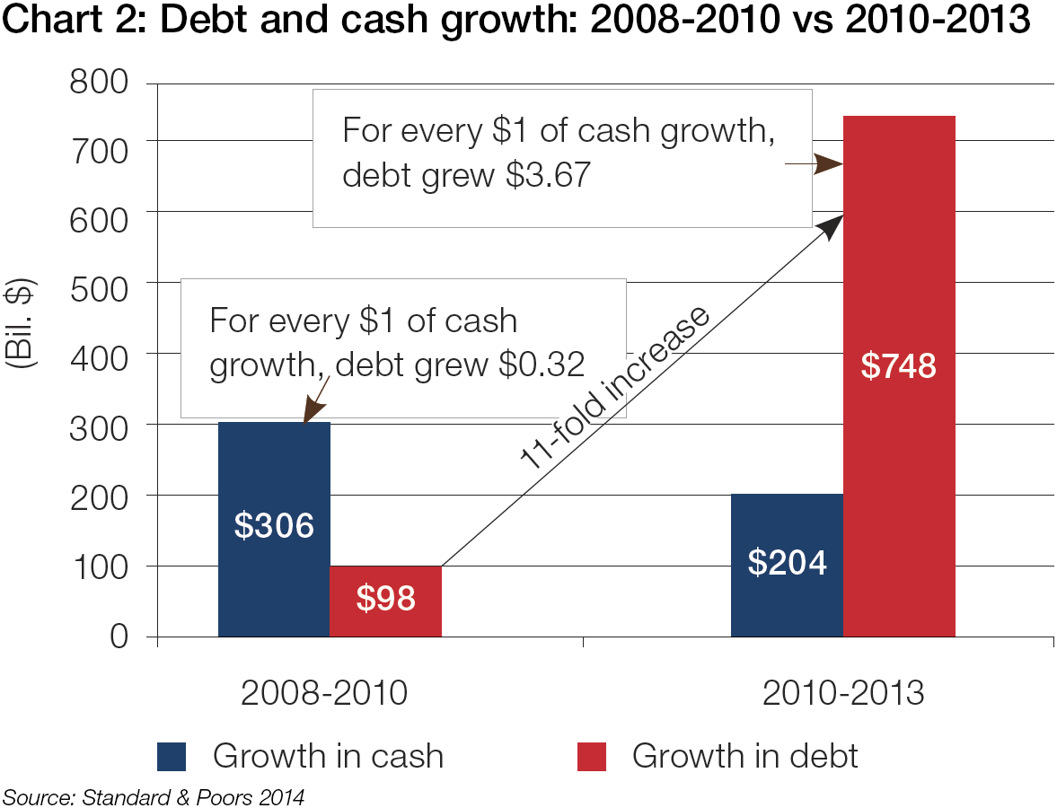 Chart 2: Debt and cash growth: 2008-2010 vs 2010-2013