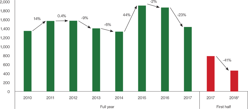 At the same time, however, developing economies saw FDI flows decline only 4% over the first half of 2018 to US$310bn versus the same period in 2017. This grouping includes developing Asia, where flows declined 4% to US$220bn, mainly due to a 16% decline in investment in East Asia. China bucked the wider trend most though – it was the largest recipient of foreign direct investment in the first half, attracting more than US$70bn, indicating there is still significant long-term investor confidence in the country.